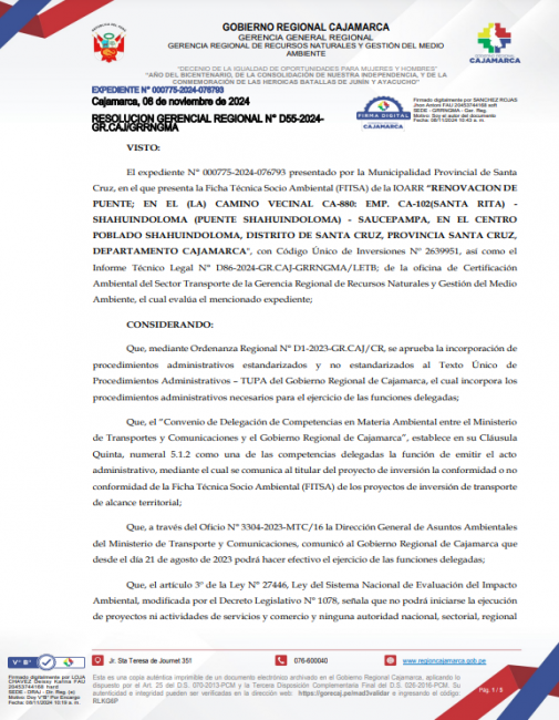 Resolución Gerencial Regional N° D55-2024-GR.CAJ/GRRNGMA