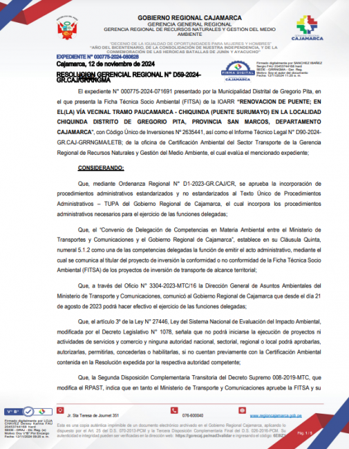 Resolución Gerencial Regional N° D59-2024-GR.CAJ/GRRNGMA