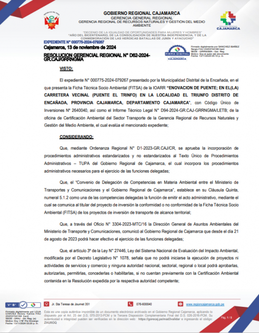 Resolución Gerencial Regional N° D62-2024-GR.CAJ/GRRNGMA