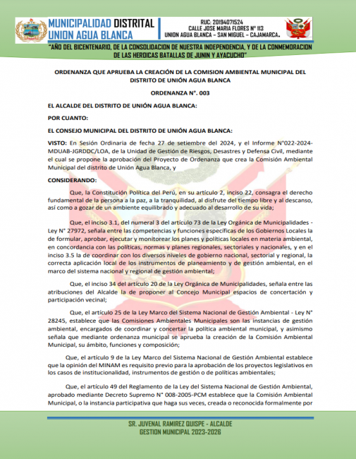 CREACIÓN DE LA COMISION AMBIENTAL MUNICIPAL (CAM) DEL DISTRITO DE UNION AGUA BLANCA - SAN MIGUEL