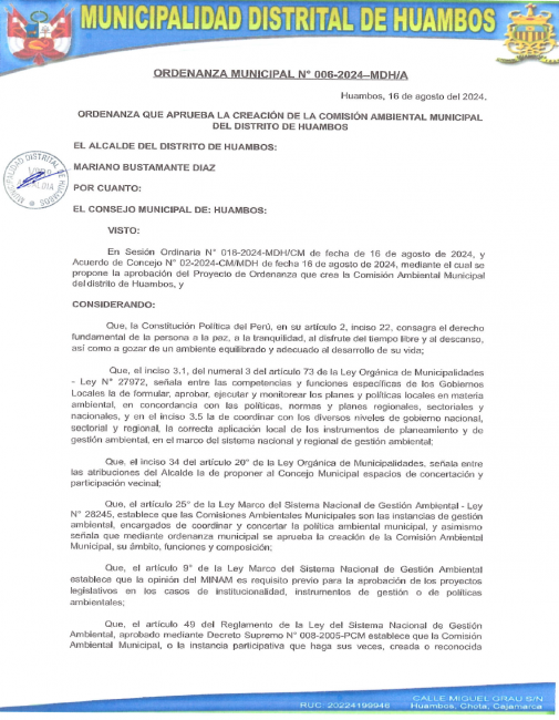 CREACIÓN DE LA COMISION AMBIENTAL MUNICIPAL (CAM) DEL DISTRITO DE HUAMBOS- CHOTA
