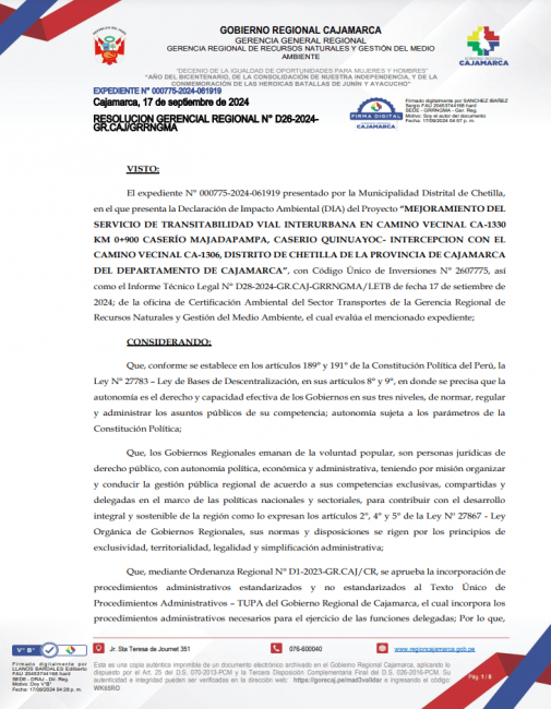 Resolución Gerencial Regional N° D26-2024-GR.CAJ/GRRNGMA