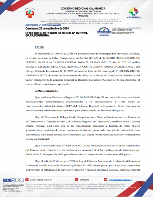 Resolución Gerencial Regional N° D27-2024-GR.CAJ/GRRNGMA