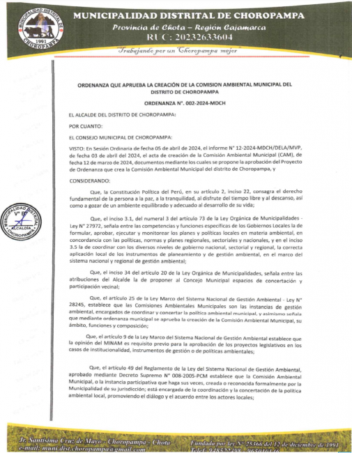 CREACIÓN DE LA COMISION AMBIENTAL MUNICIPAL (CAM) DEL DISTRITO DE CHOROPAMPA - CHOTA