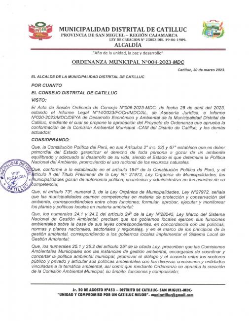 CREACIÓN DE LA COMISION AMBIENTAL MUNICIPAL (CAM) DEL DISTRITO DE CATILLUC