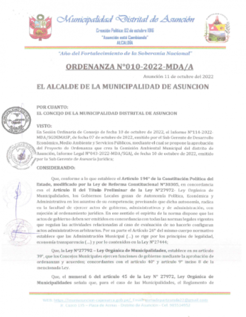 CREACIÓN DE LA COMISION AMBIENTAL MUNICIPAL (CAM) DEL DISTRITO DE LA ASUNCIÓN - CAJAMARCA