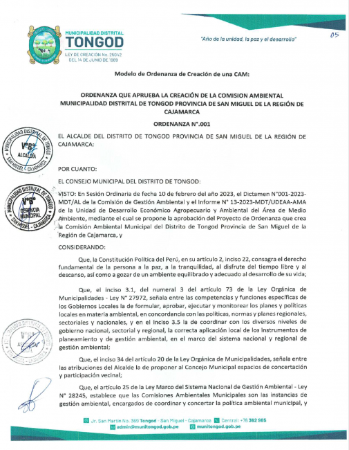 CREACIÓN DE LA COMISION AMBIENTAL MUNICIPAL (CAM) DEL DISTRITO DE TONGOD - SAN MIGUEL