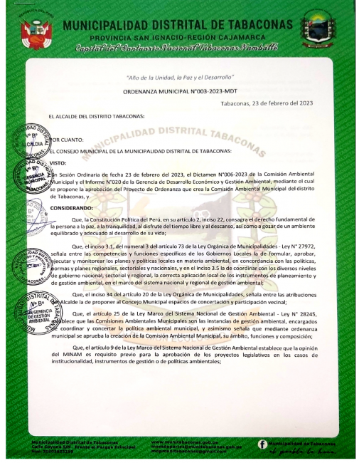 CREACIÓN DE LA COMISION AMBIENTAL MUNICIPAL (CAM) DEL DISTRITO DE TABACONAS - SAN IGNACIO