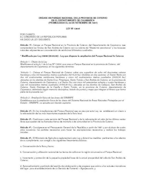 LEY N° 13694 - Ley que Crea el Parque Nacional de Cutervo