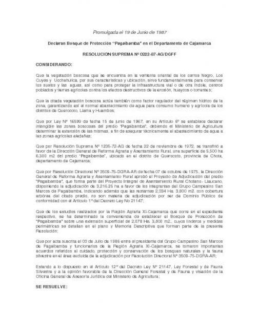 Resolución Suprema Nº 0222-87-AG/DGFF, Declaran Bosque de Protección “Pagaibamba”