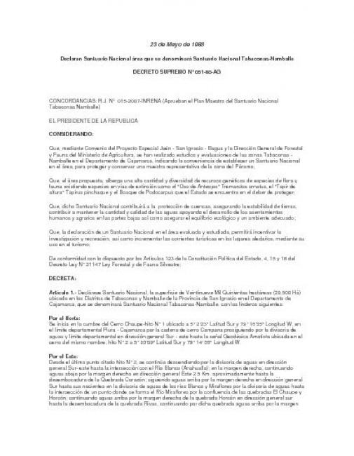 Decreto Supremo N° 051-88-AG, Declaran Santuario Nacional área que se denominará Santuario Nacional Tabaconas-Namballe