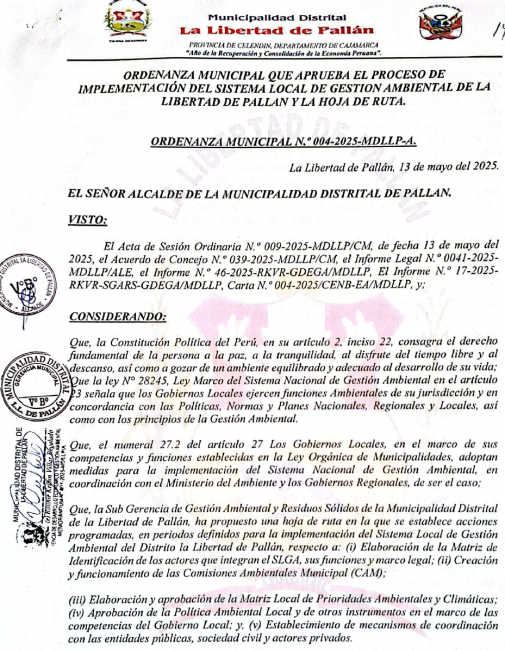 ORDENANZA MUNICIPAL QUE APRUEBA EL PROCESO DE IMPLEMENTACIÓN DEL SISTEMA REGIONAL DE GESTION AMBIENTAL DEL DISTRITO DE LA LIBERTAD DE PALLAN -CELENDIN Y LA HOJA DE RUTA