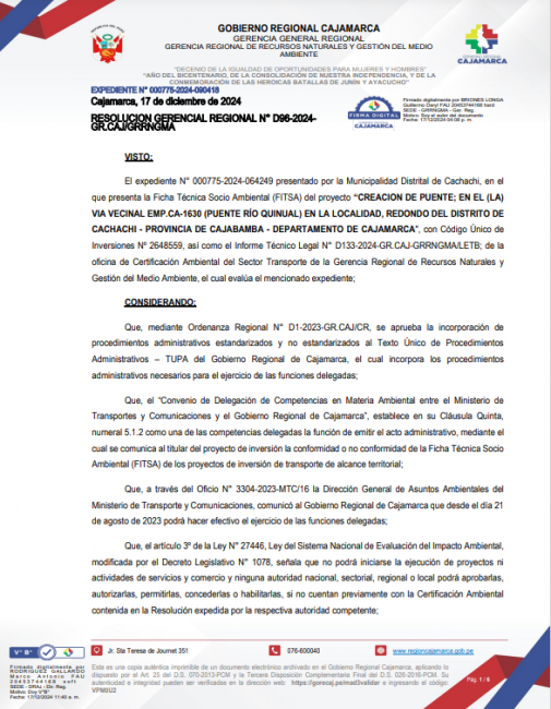 Resolución Gerencial Regional N° D96-2024-GR.CAJ/GRRNGMA