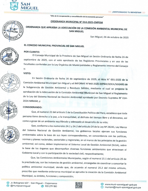 Ordenanza Municipal N° 014-2025-CMPSM(CAM)