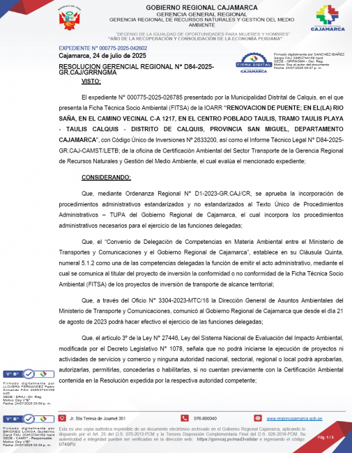 Resolución Gerencial Regional N° D84-2025-GR.CAJ-GRRNGMA