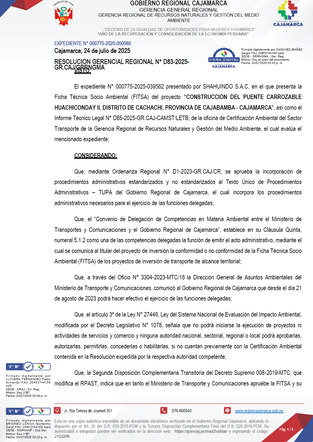 "CONSTRUCCION DEL PUENTE CARROZABLE HUACHICONDAY II, DISTRITO DE CACHACHI, PROVINCIA DE CAJABAMBA-CAJAMARCA"