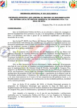 Ordenanza Municipal Nro. N°005-2025-MDGP-A .- ORDENANZA MUNICIPAL QUE APRUEBA EL PROCESO DE IMPLEMENTACIÓN DEL SISTEMA REGIONAL DE GESTION AMBIENTAL DEL DISTRITO DE GREGORIO PITA -SAN MARCOS Y LA HOJA DE RUTA