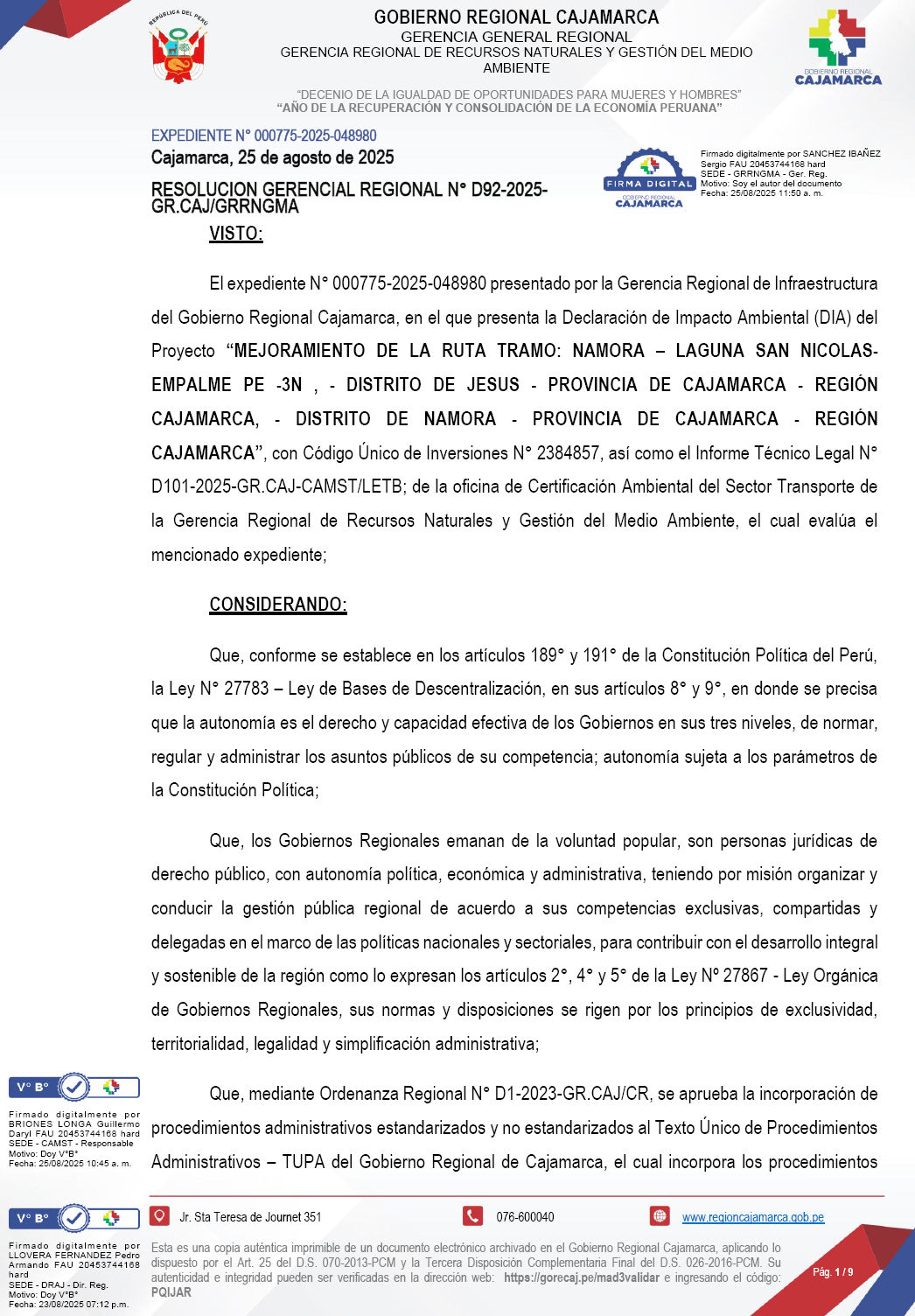 Resolución Gerencial Regional N° D92-2025-GR.CAJ-GRRNGMA .- "MEJORAMIENTO DE LA RUTA TRAMO: NAMORA-LA LAGUNA SAN NICOLAS-EMPALME PE-3N, DISTRITO DE JESUS-PROVINCIA DE CAJAMARCA-REGION CAJAMARCA, DISTRITO DE NAMORA-PROVINCIA DE CAJAMARCA-REGION DE CAJAMARCA