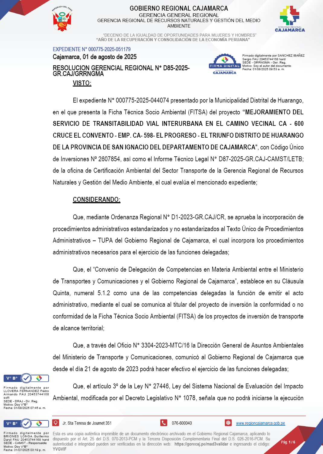 Resolución Gerencial Regional N° D85-2025-GR.CAJ-GRRNGMA .- "MEJORAMIENTO DEL SERVICIO DE TRANSITABILIDAD VIAL INTERURBANA EN EL CAMINO VECINAL CA-600 CRUCE EL CONVENTO-EMP-CA-598-EL PROGRESO-EL TRIUNFO DISTRITO DE HUARANGO DE LA PROVINCIA DE SAN IGNACIO DEL DEPARTAMENTO DE CAJAMARCA"