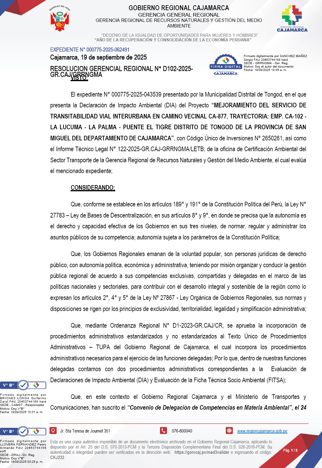 Resolución Gerencial Regional N° D102-2025-GR.CAJ-GRRNGMA .- MEJORAMIENTO DEL SERVICIO DE TRANSITABILIDAD VIAL INTERURBANA EN CAMINO VECINAL CA-877, TRAYECTORIA: EMP.CA-102 LA LUCUMA-LA PALMA-PUENTE EL TIGRE DISTRITO DE TONGOD DE LA PROVINCIA DE SAN MIGUEL DEL DEPARTAMENTO DE CAJAMARCA"