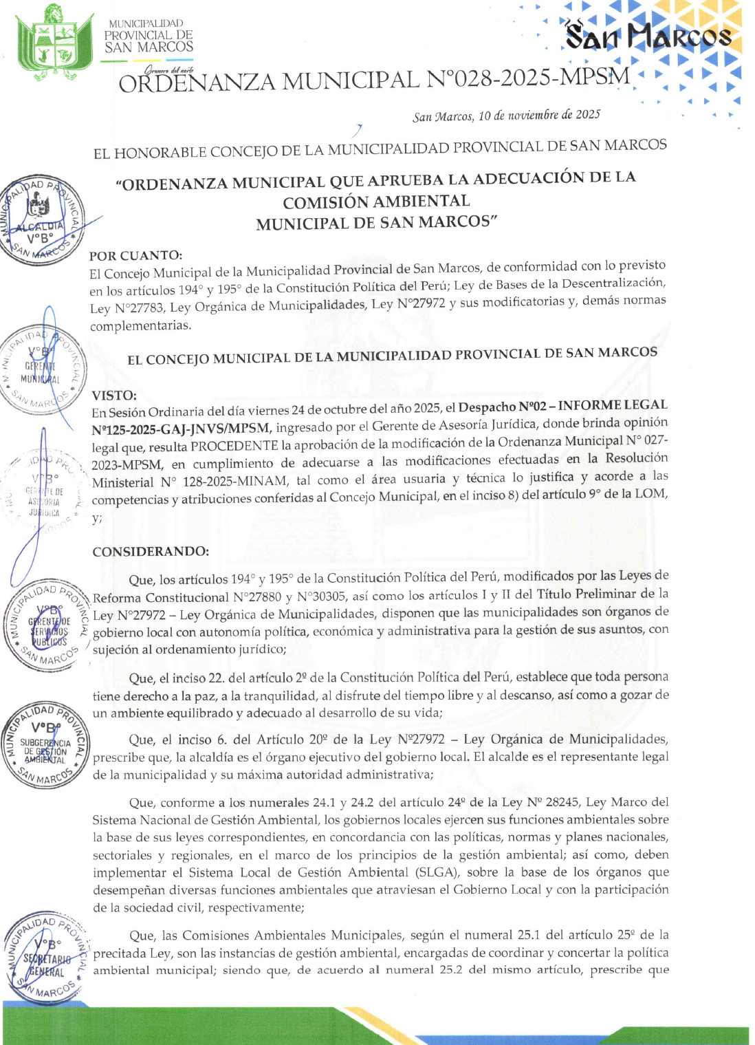 ORDENANZA MUNICIPAL QUE APRUEBA LA ADECUACIÓN DE LA COMISION AMBIENTAL MUNICIPAL (CAM) DE LA PROVINCIA DE SAN MARCOS