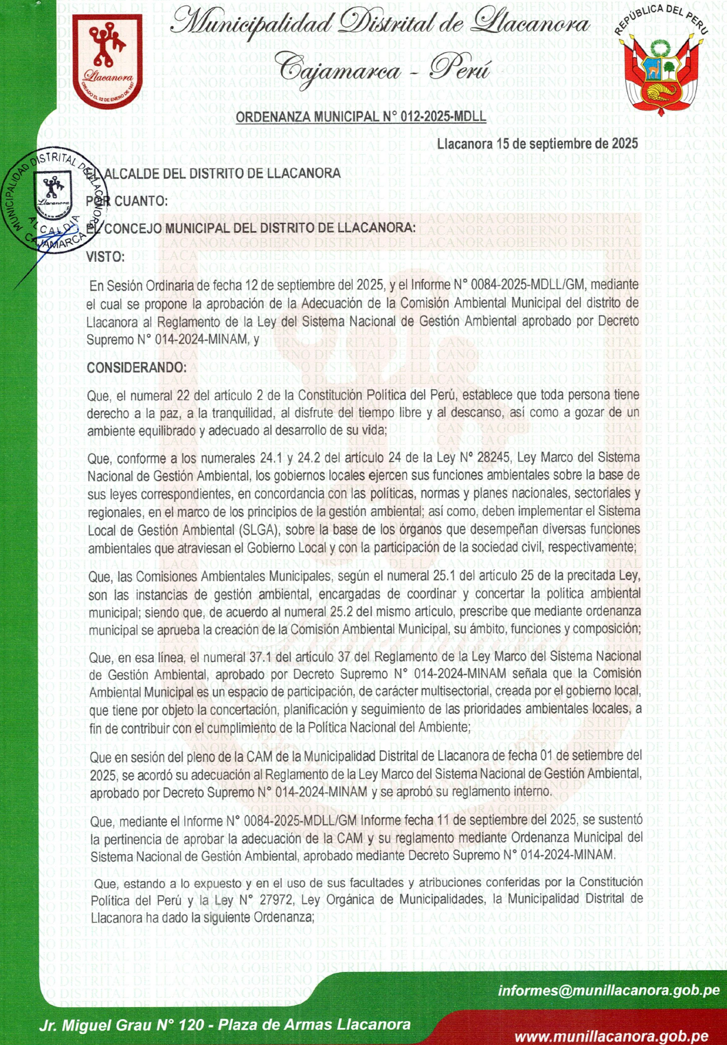 ORDENANZA MUNICIPAL QUE APRUEBA LA ADECUACIÓN DE LA COMISION AMBIENTAL MUNICIPAL (CAM) DEL DISTRITO DE LLACANORA PROVINCIA DE CAJAMARCA