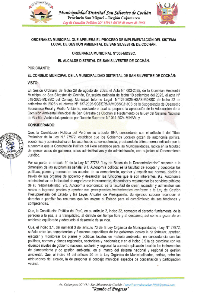 ORDENANZA MUNICIPAL QUE APRUEBA EL PROCESO DE IMPLEMENTACIÓN DEL SISTEMA REGIONAL DE GESTION AMBIENTAL DEL DISTRITO DE SAN SILVESTRE DE COCHAN -SAN MIGUEL Y LA HOJA DE RUTA