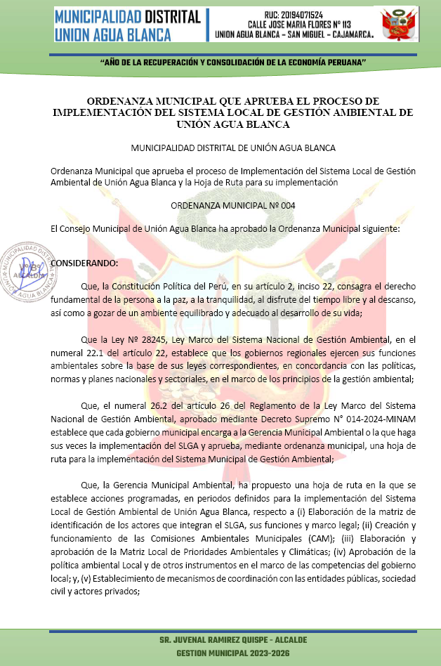 Ordenanza Municipal N° 004-2025-UNION AGUA BLANCA .- ORDENANZA MUNICIPAL QUE APRUEBA EL PROCESO DE IMPLEMENTACIÓN DEL SISTEMA REGIONAL DE GESTION AMBIENTAL DEL DISTRITO DE UNION AGUA BLANCA -SAN MIGUEL Y LA HOJA DE RUTA