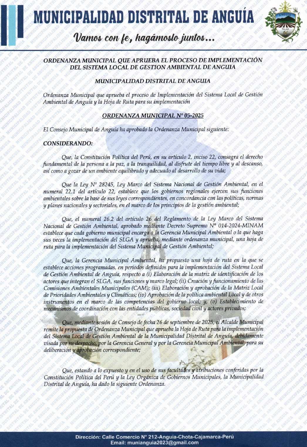 ORDENANZA MUNICIPAL QUE APRUEBA EL PROCESO DE IMPLEMENTACIÓN DEL SISTEMA REGIONAL DE GESTION AMBIENTAL DEL DISTRITO DE ANGUIA -CHOTA Y LA HOJA DE RUTA