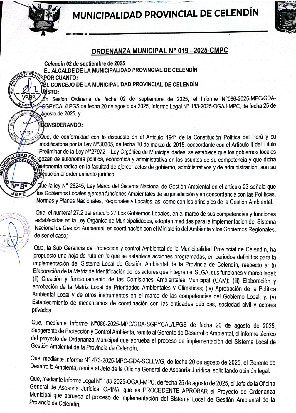 ORDENANZA MUNICIPAL QUE APRUEBA EL PROCESO DE IMPLEMENTACIÓN DEL SISTEMA REGIONAL DE GESTION AMBIENTAL DE LA PROVINCIA DE CELENDIN Y LA HOJA DE RUTA
