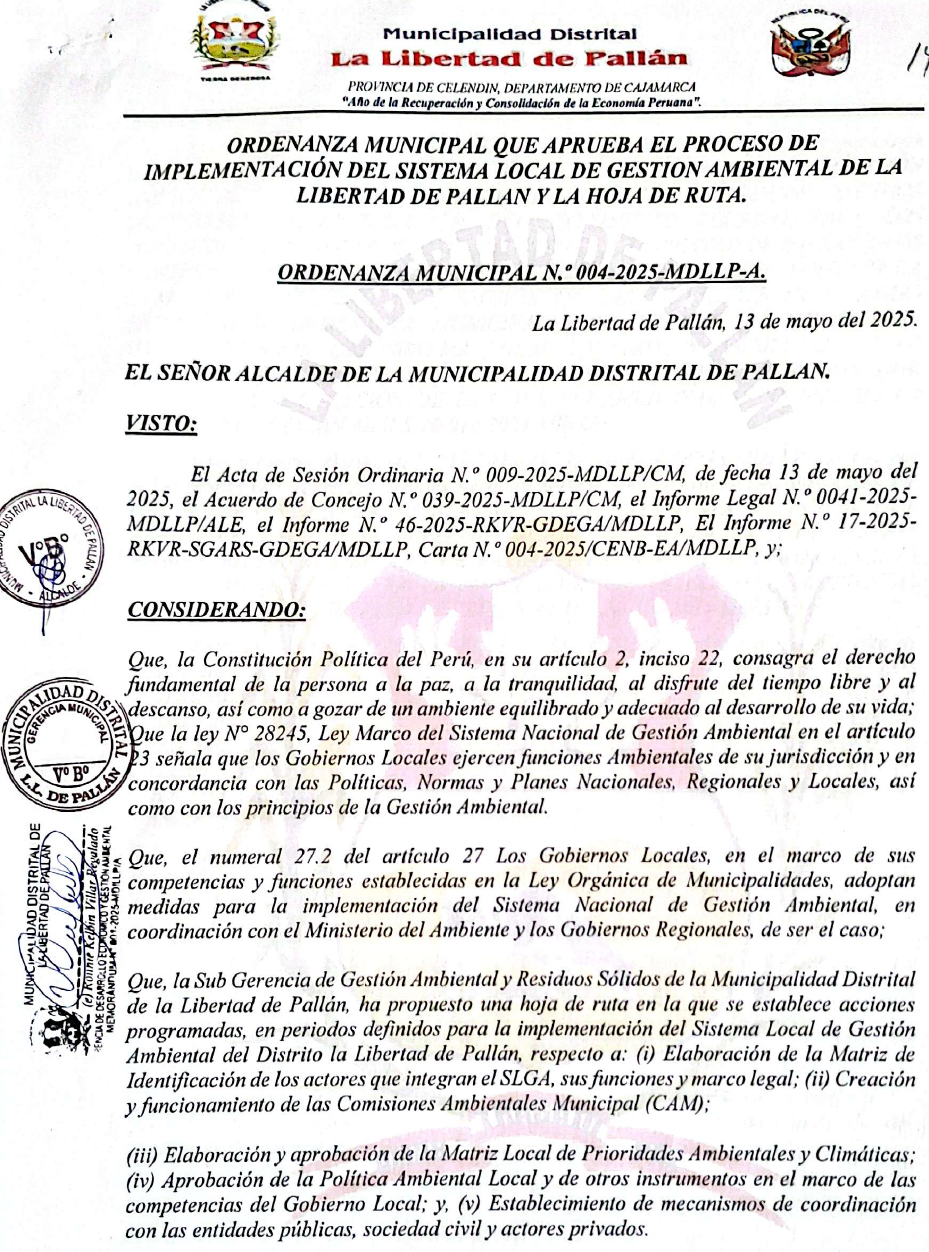 Ordenanza Municipal N° 004-2025.MDLLP-A .- ORDENANZA MUNICIPAL QUE APRUEBA EL PROCESO DE IMPLEMENTACIÓN DEL SISTEMA REGIONAL DE GESTION AMBIENTAL DEL DISTRITO DE LA LIBERTAD DE PALLAN -CELENDIN Y LA HOJA DE RUTA