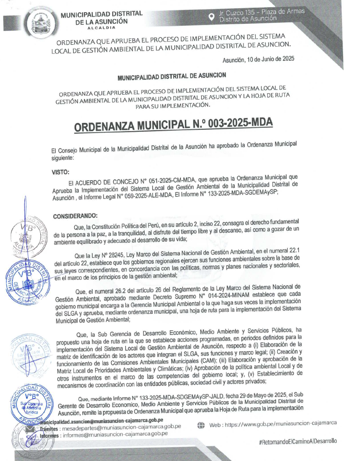 Ordenanza Municipal N° 003-2025-MDA ASUNCION .- ORDENANZA MUNICIPAL QUE APRUEBA EL PROCESO DE IMPLEMENTACIÓN DEL SISTEMA REGIONAL DE GESTION AMBIENTAL DEL DISTRITO DE ASUNCION -CAJAMARCA Y LA HOJA DE RUTA