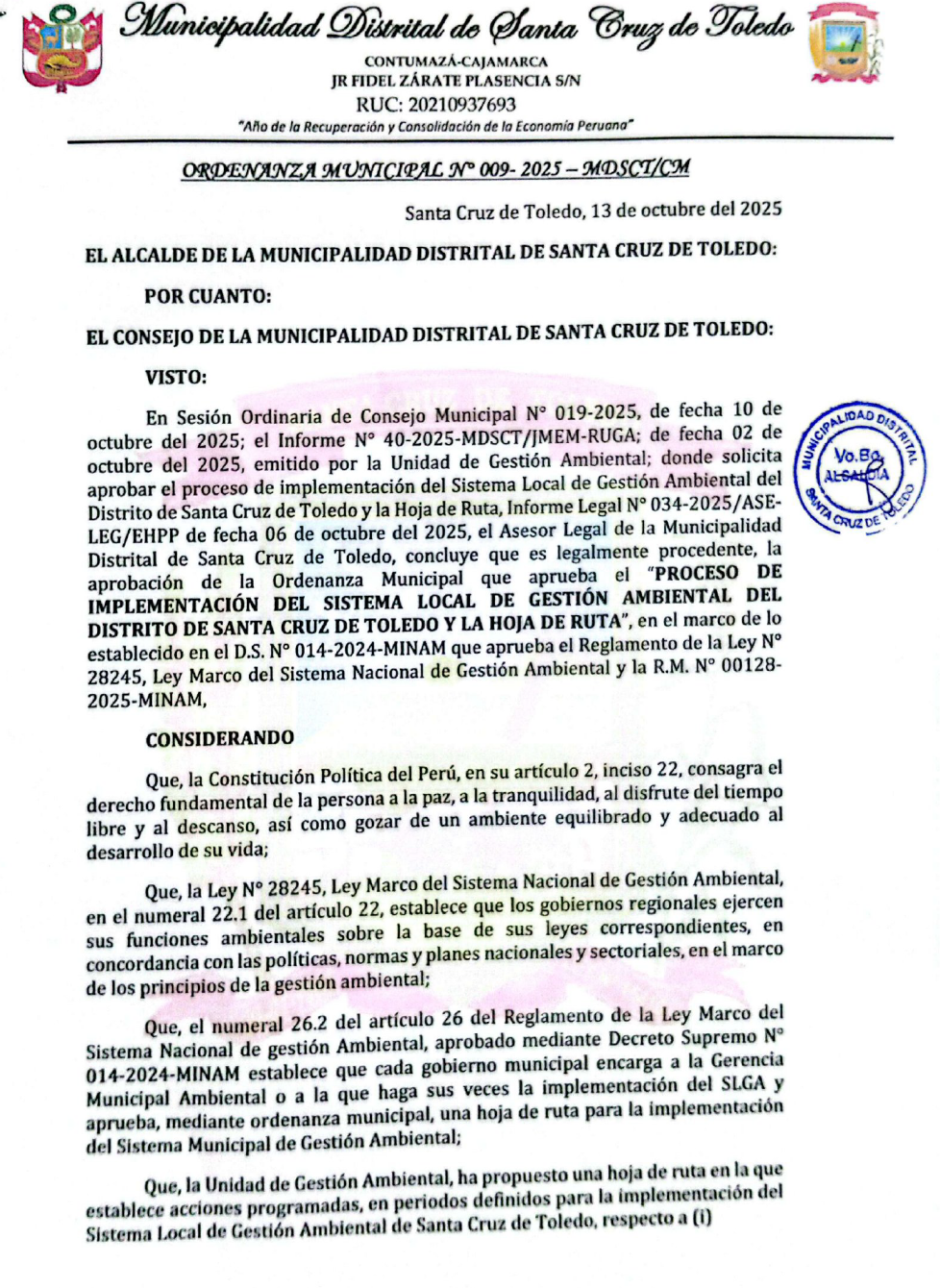 Ordenanza Municipal N° 009-2025-MDSCT-CM-SANTA CRUZ DE TOLEDO .- ORDENANZA MUNICIPAL QUE APRUEBA EL PROCESO DE IMPLEMENTACIÓN DEL SISTEMA REGIONAL DE GESTION AMBIENTAL DEL DISTRITO DE SANTA CRUZ DE TOLEDO -CONTUMAZA Y LA HOJA DE RUTA