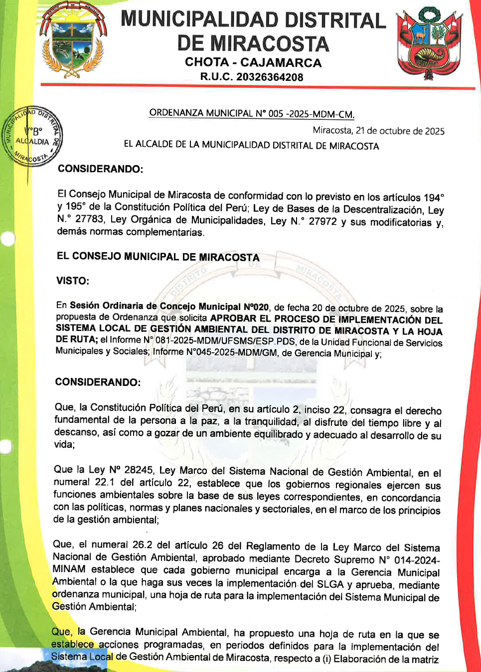 Ordenanza Municipal N° 005-2025-SLGA MIRACOSTA .- ORDENANZA MUNICIPAL QUE APRUEBA EL PROCESO DE IMPLEMENTACIÓN DEL SISTEMA REGIONAL DE GESTION AMBIENTAL DEL DISTRITO DE MIRACOSTA -CHOTA Y LA HOJA DE RUTA