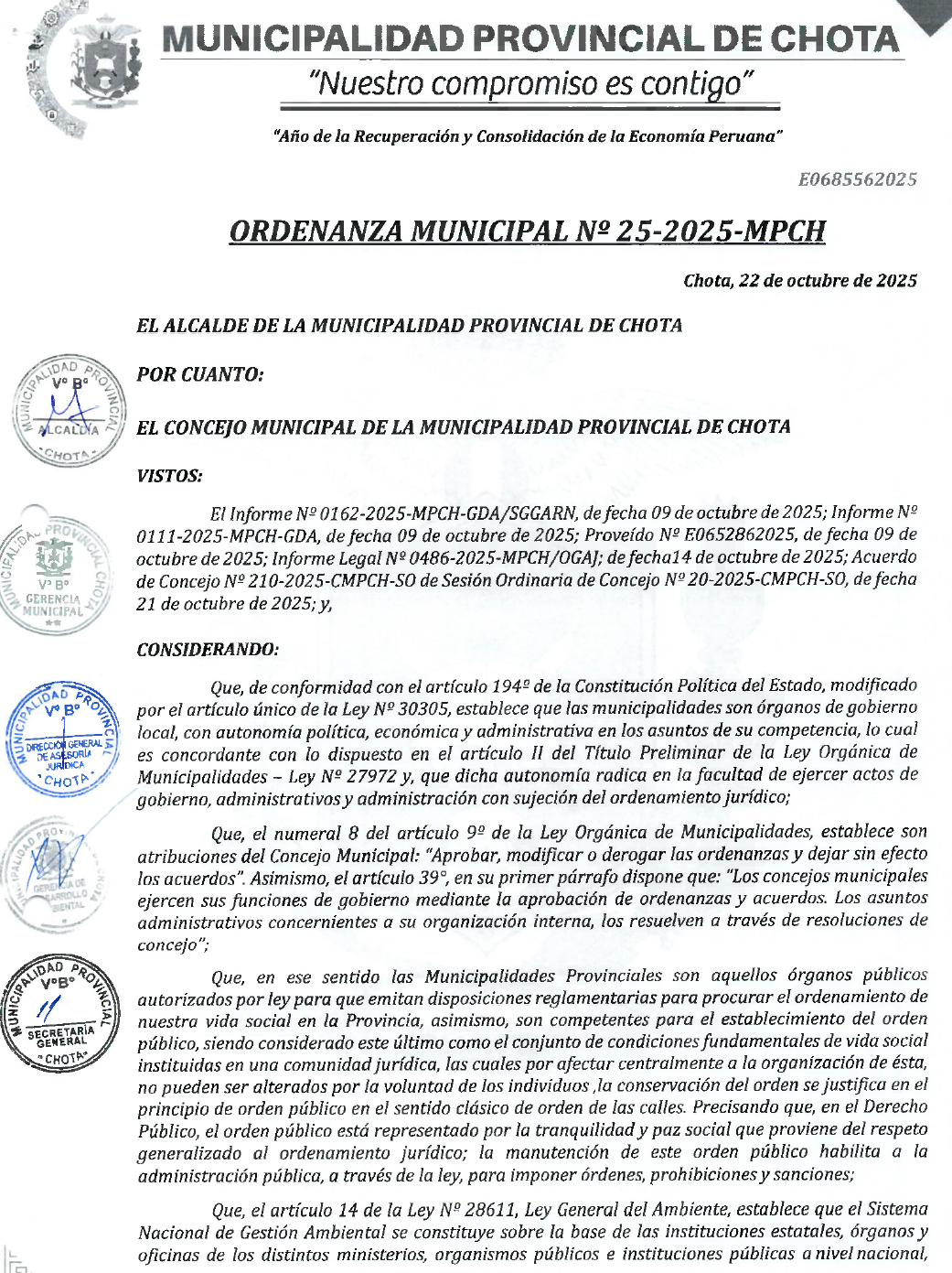 ORDENANZA MUNICIPAL QUE APRUEBA EL PROCESO DE IMPLEMENTACIÓN DEL SISTEMA REGIONAL DE GESTION AMBIENTAL DE PROVINCIA DE CHOTA Y LA HOJA DE RUTA