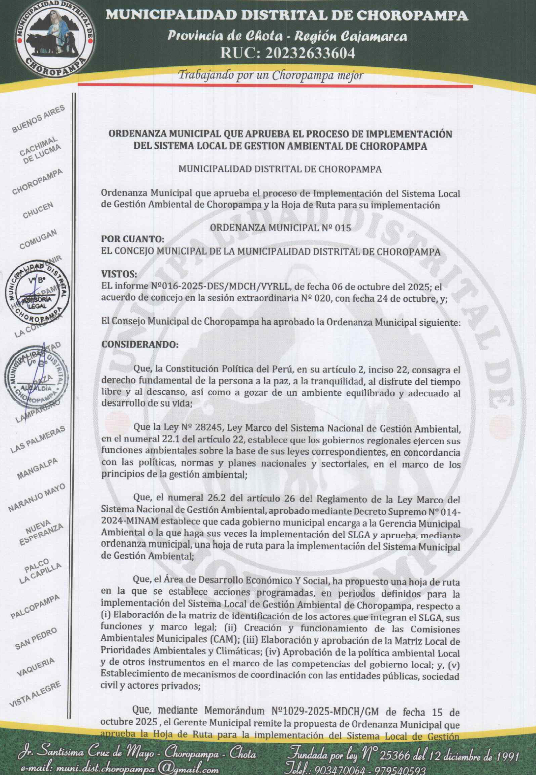 Ordenanza Municipal N° 15-2025 CHOROPAMPA .- ORDENANZA MUNICIPAL QUE APRUEBA EL PROCESO DE IMPLEMENTACIÓN DEL SISTEMA REGIONAL DE GESTION AMBIENTAL DEL DISTRITO DE CHOROPAMPA -CHOTA Y LA HOJA DE RUTA
