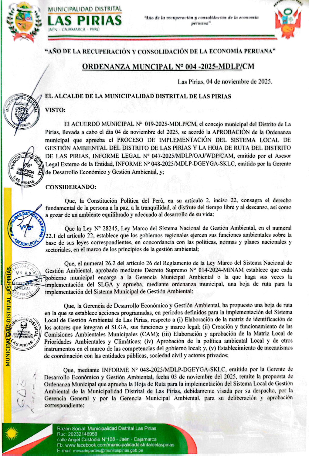 Ordenanza Municipal N° 04-2025-MDLP-CM .- ORDENANZA MUNICIPAL QUE APRUEBA EL PROCESO DE IMPLEMENTACIÓN DEL SISTEMA REGIONAL DE GESTION AMBIENTAL DEL DISTRITO DE LAS PIRIAS -JAEN Y LA HOJA DE RUTA