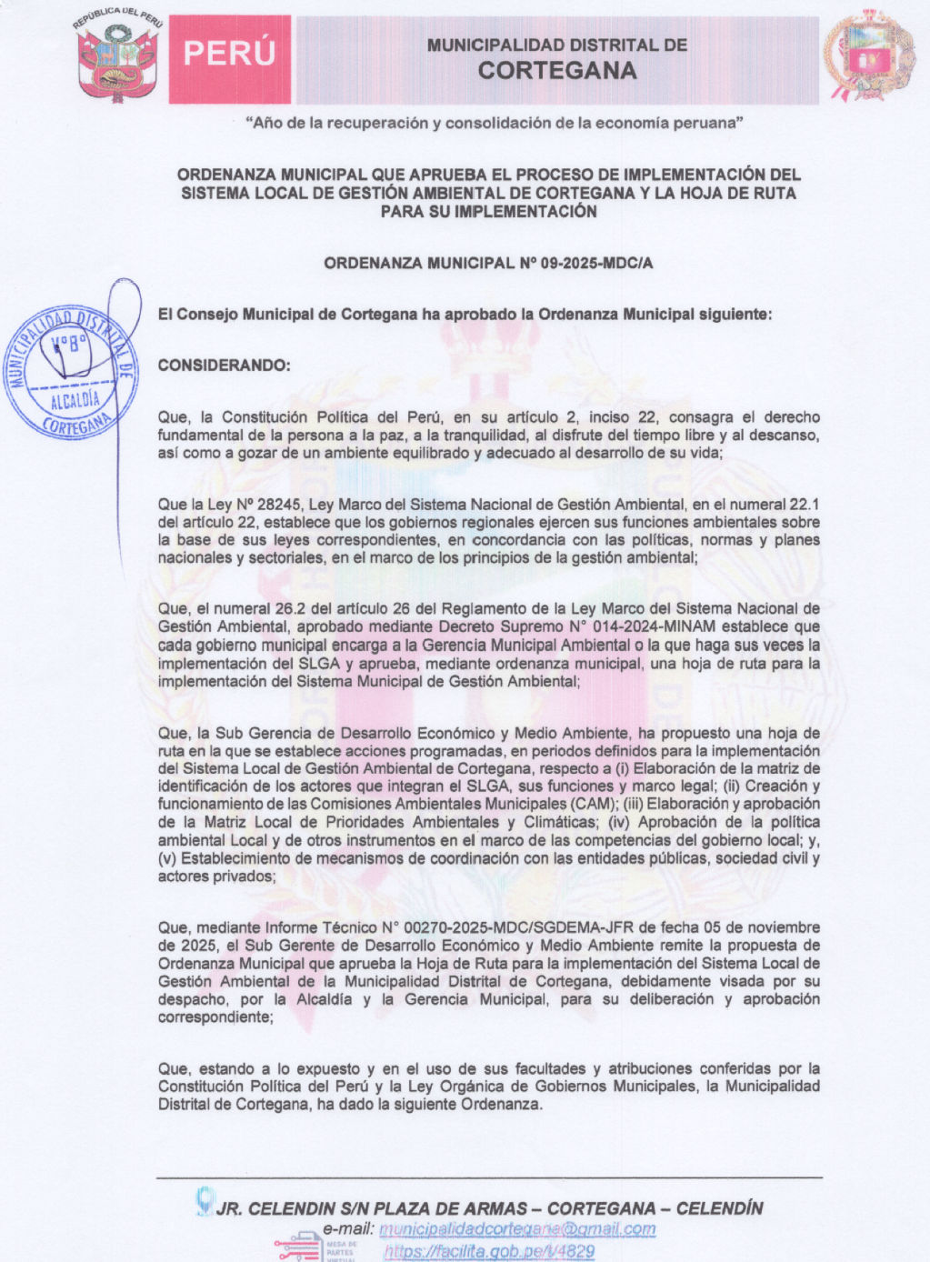 Ordenanza Municipal N° 09-2025 MDC-A .- ORDENANZA MUNICIPAL QUE APRUEBA EL PROCESO DE IMPLEMENTACIÓN DEL SISTEMA REGIONAL DE GESTION AMBIENTAL DEL DISTRITO DE CORTEGANA -CELENDIN Y LA HOJA DE RUTA