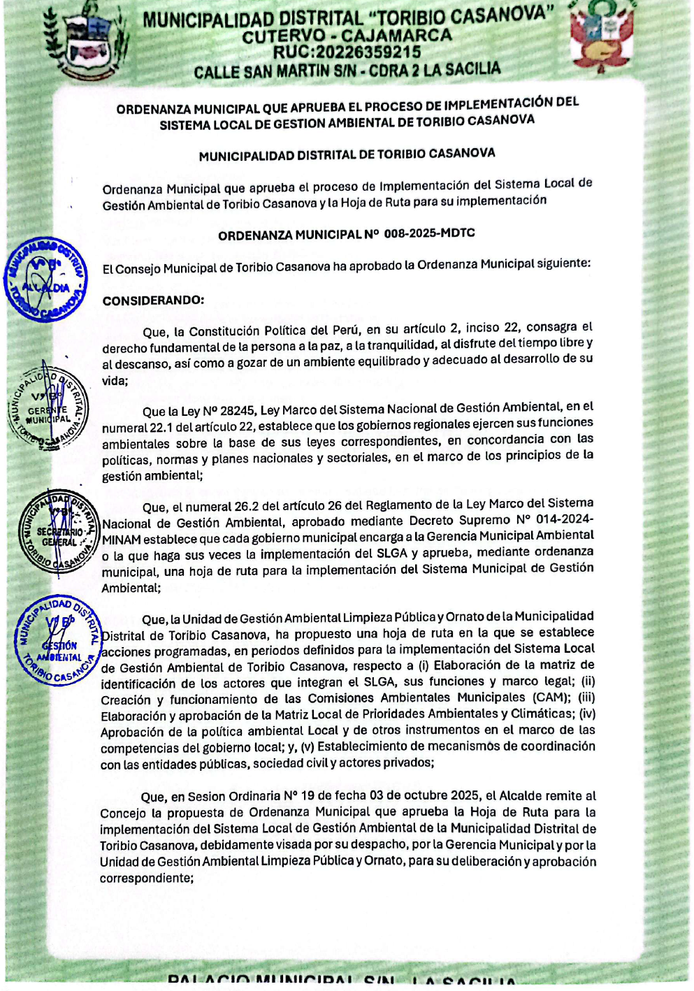 Ordenanza Municipal N° 008-2025-MDTC .- ORDENANZA MUNICIPAL QUE APRUEBA EL PROCESO DE IMPLEMENTACIÓN DEL SISTEMA REGIONAL DE GESTION AMBIENTAL DEL DISTRITO DE TORIBIO CASANOVA - CUTERVO Y LA HOJA DE RUTA