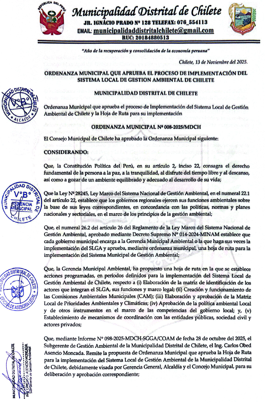ORDENANZA MUNICIPAL QUE APRUEBA EL PROCESO DE IMPLEMENTACIÓN DEL SISTEMA REGIONAL DE GESTION AMBIENTAL DEL DISTRITO DE CHILETE -CONTUMAZA Y LA HOJA DE RUTA