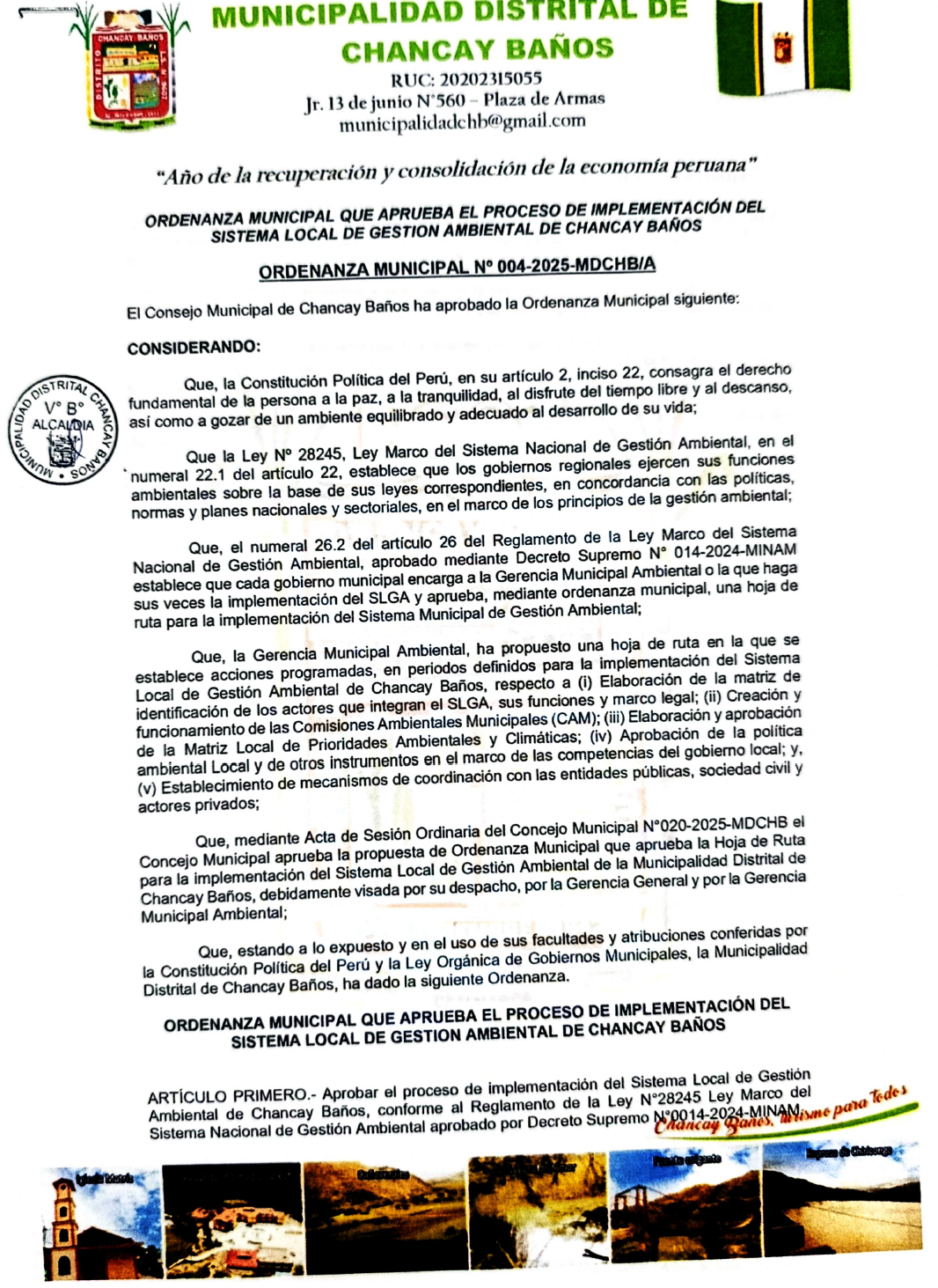 ORDENANZA MUNICIPAL QUE APRUEBA EL PROCESO DE IMPLEMENTACIÓN DEL SISTEMA REGIONAL DE GESTION AMBIENTAL DEL DISTRITO DE CHANCAY BAÑOS -SANTA CRUZ Y LA HOJA DE RUTA