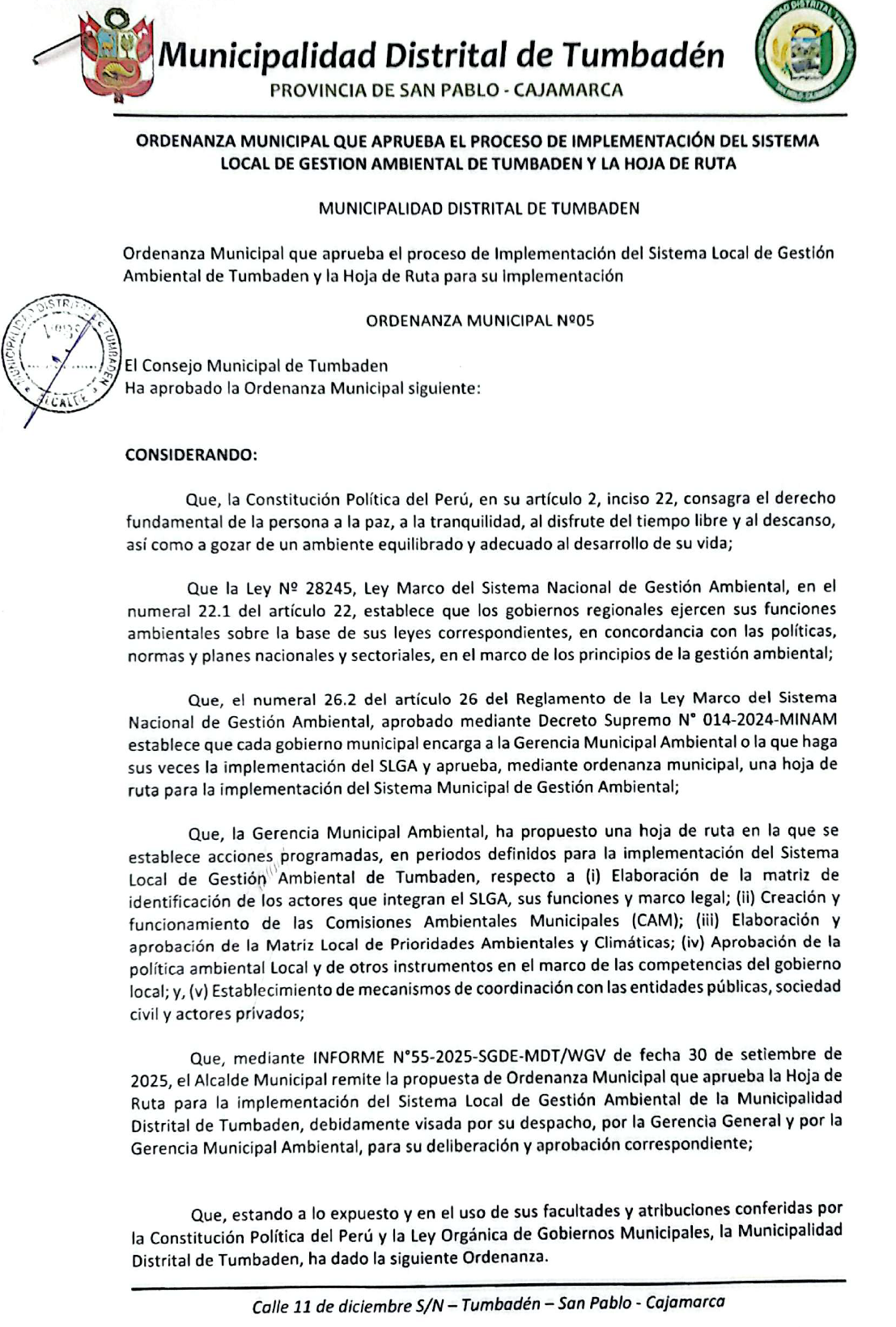 Ordenanza Municipal N° 05-2025 SLGA TUMBADEN .- ORDENANZA MUNICIPAL QUE APRUEBA EL PROCESO DE IMPLEMENTACIÓN DEL SISTEMA REGIONAL DE GESTION AMBIENTAL DEL DISTRITO DE TUMBADEN -SAN PABLO Y LA HOJA DE RUTA