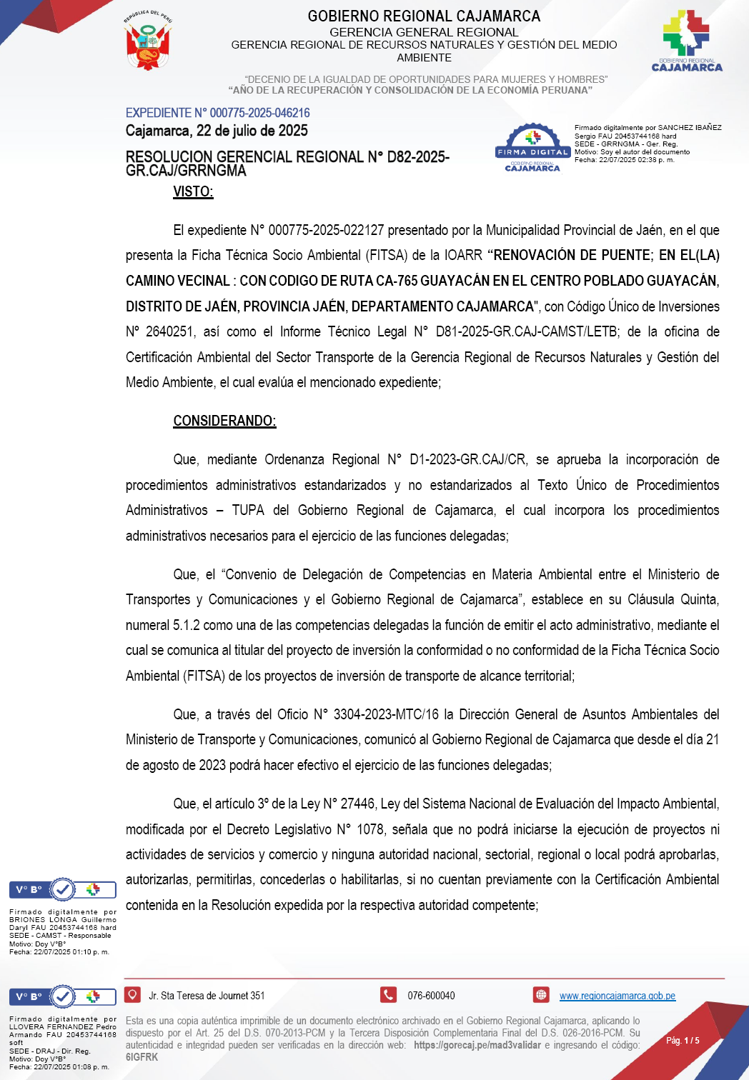 Resolución Gerencial Regional N° D82-2025-GR.CAJ-GRRNGMA .- "RENOVACION DE PUENTE; EN EL(LA) CAMINO VECINAL: CON CODIGO DE RUTA CA-765 GUAYACAN EN EL CENTRO POBLADO GUAYACAN, DISTRITO DE JAEN, PROVINCIA DE JAEN, DEPARTAMENTO DE CAJAMARCA"