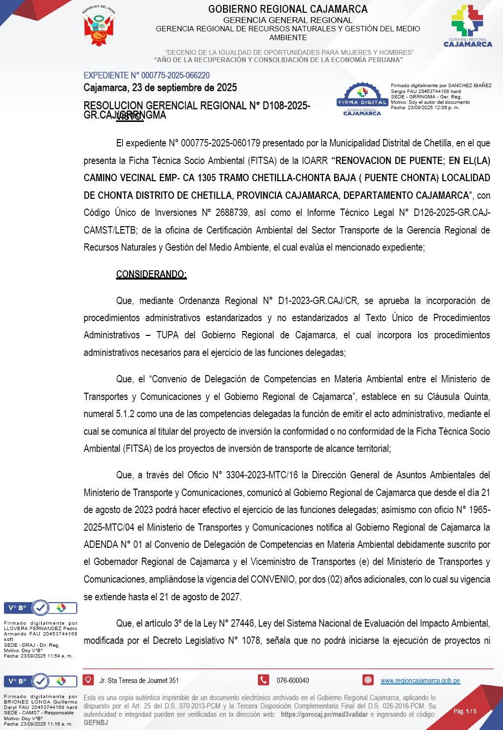 Resolución Gerencial Regional N° D108-2025-GR.CAJ-GRRNGMA .- "RENOVACION DE PUENTE; EN EL(LA) CAMINO VECINAL EMP-CA 1305 TRAMO CHETILLA-CHONTA BAJA( PUENTE CHONTA) LOCALIDAD DE CHONTA DISTRITO DE CHETILLA, PROVINCIA CAJAMARCA, DEPARTAMENTO CAJAMARCA"