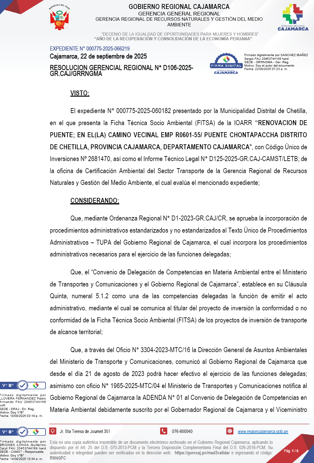 "RENOVACION DE PUENTE; EN EL(LA) CAMINO VECINAL EMP R0601-55/PUENTE CHONTAPACCHA DISTRITO DE CHETILLA, PROVINCIA CAJAMARCA, DEPARTAMENTO CAJAMARCA"