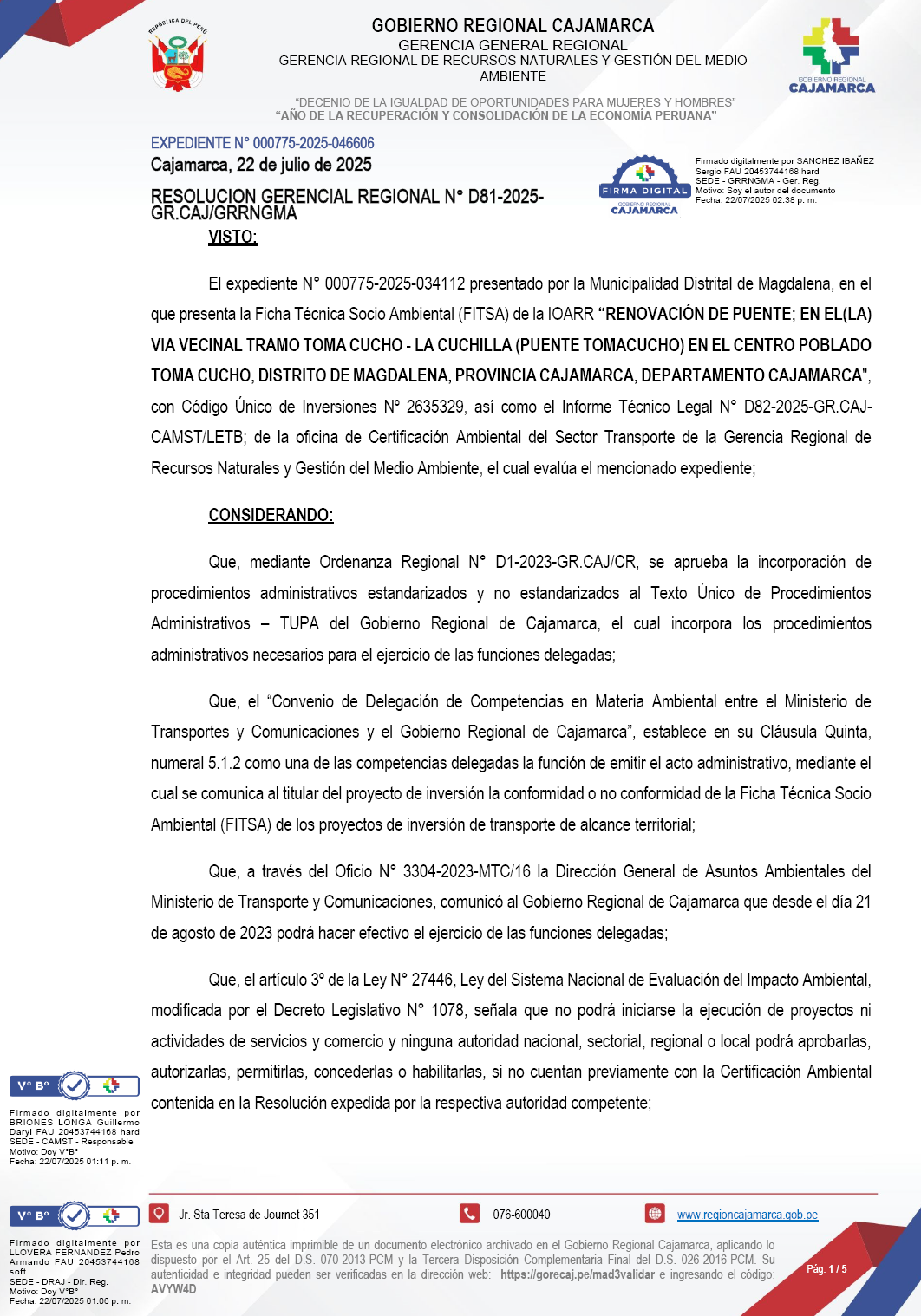 Resolución Gerencial Regional N° D81-2025-GR.CAJ-GRRNGMA .- "RENOVACION DE PUENTE; EN EL(LA) VIA VECINAL TRAMO TOMA CUCHO-LA CUCHILLA(PUENTE TOMACUCHO) EN EL CENTRO POBLADO TOMA CUCHO, DISTRITO DE MAGDALENA, PROVINCIA CAJAMARCA, DEPARTAMENTO CAJAMARCA"