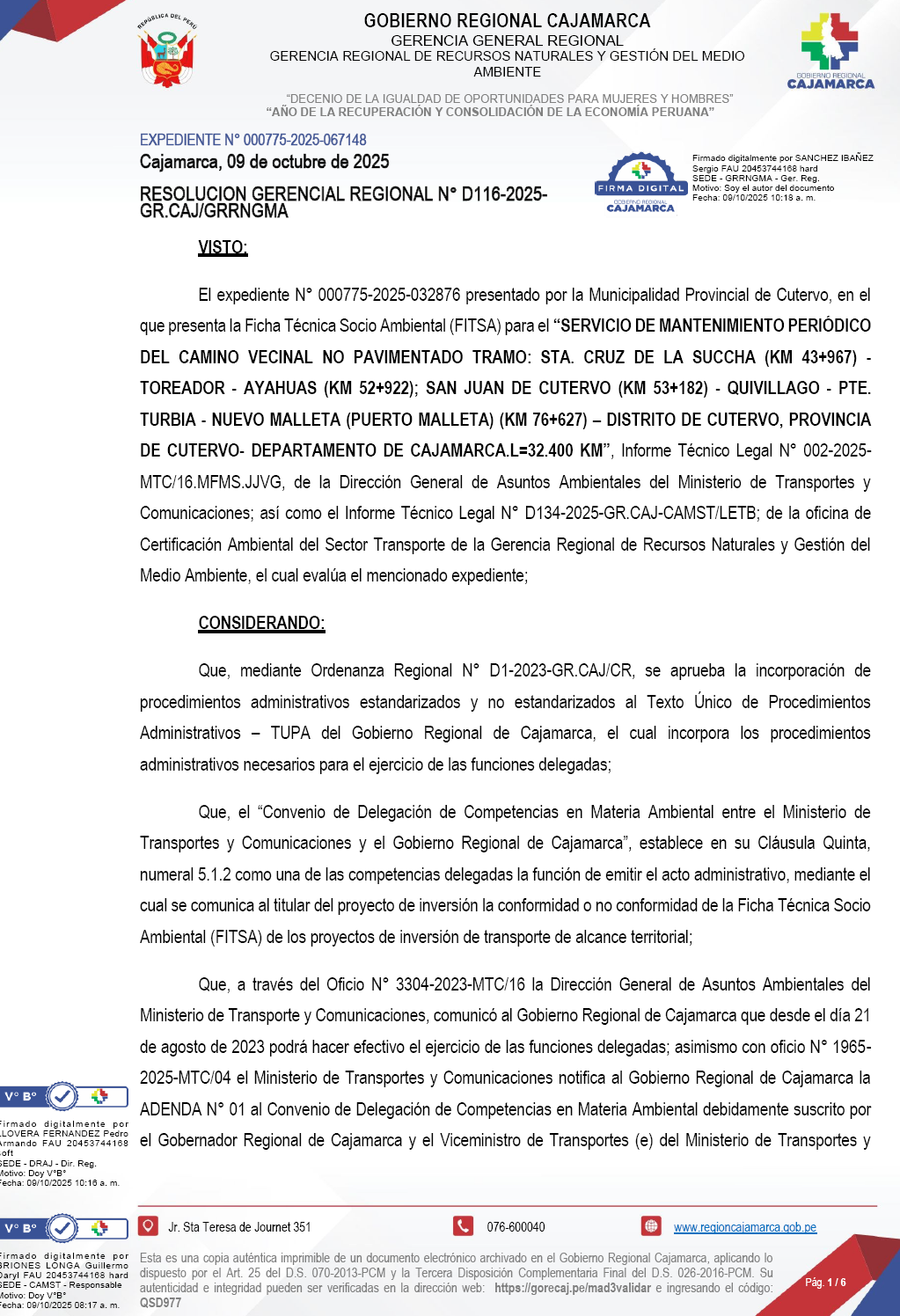 "SERVICIO DE MANTENIMIENTO PERIODICO DEL CAMINO VECINAL NO PAVIMENTADO TRAMO: STA. CRUZ DE LA SUCCHA (KM 43+967)-TOREADOR-AYAHUAS (KM 52+922); SAN JUAN DE CUTERVO (KM 53+182)QUIVILLAGO-PTE. TURBIA-NUEVO MALLETA (PUERTO MALLETA) (KM 76+627)-DISTRITO DE CUTERVO, PROVINCIA DE CUTERVO-DEPARTAMENTO DE CAJAMARCA L=32.400 KM"