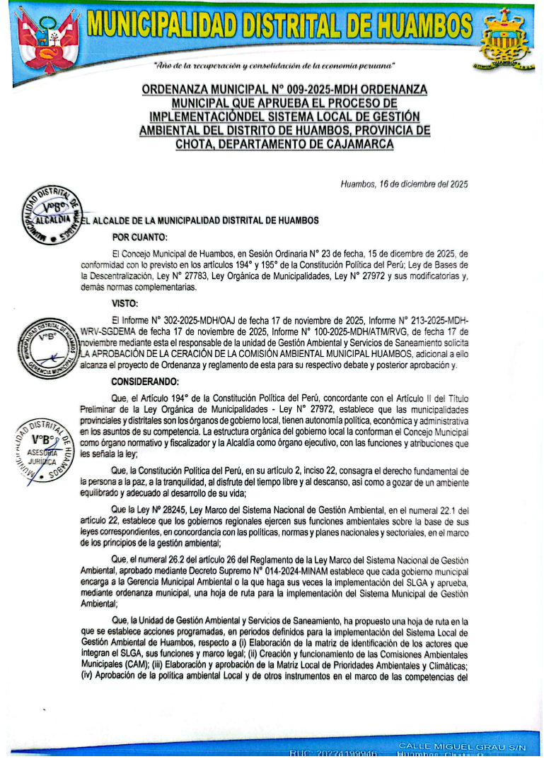 ORDENANZA MUNICIPAL QUE APRUEBA LA IMPLEMENTACIÓN DEL SISTEMA REGIONAL DE GESTION AMBIENTAL (SLGA) Y LA HOJA DE RUTA DEL DISTRITO DE HUAMBOS - CHOTA