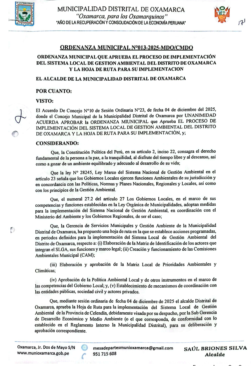 ORDENANZA MUNICIPAL N° 013-2025-MDO/CMDO, QUE APRUEBA LA IMPLEMENTACIÓN DEL SISTEMA REGIONAL DE GESTION AMBIENTAL (SLGA) Y LA HOJA DE RUTA DEL DISTRITO DE OXARMARCA - CELENDIN