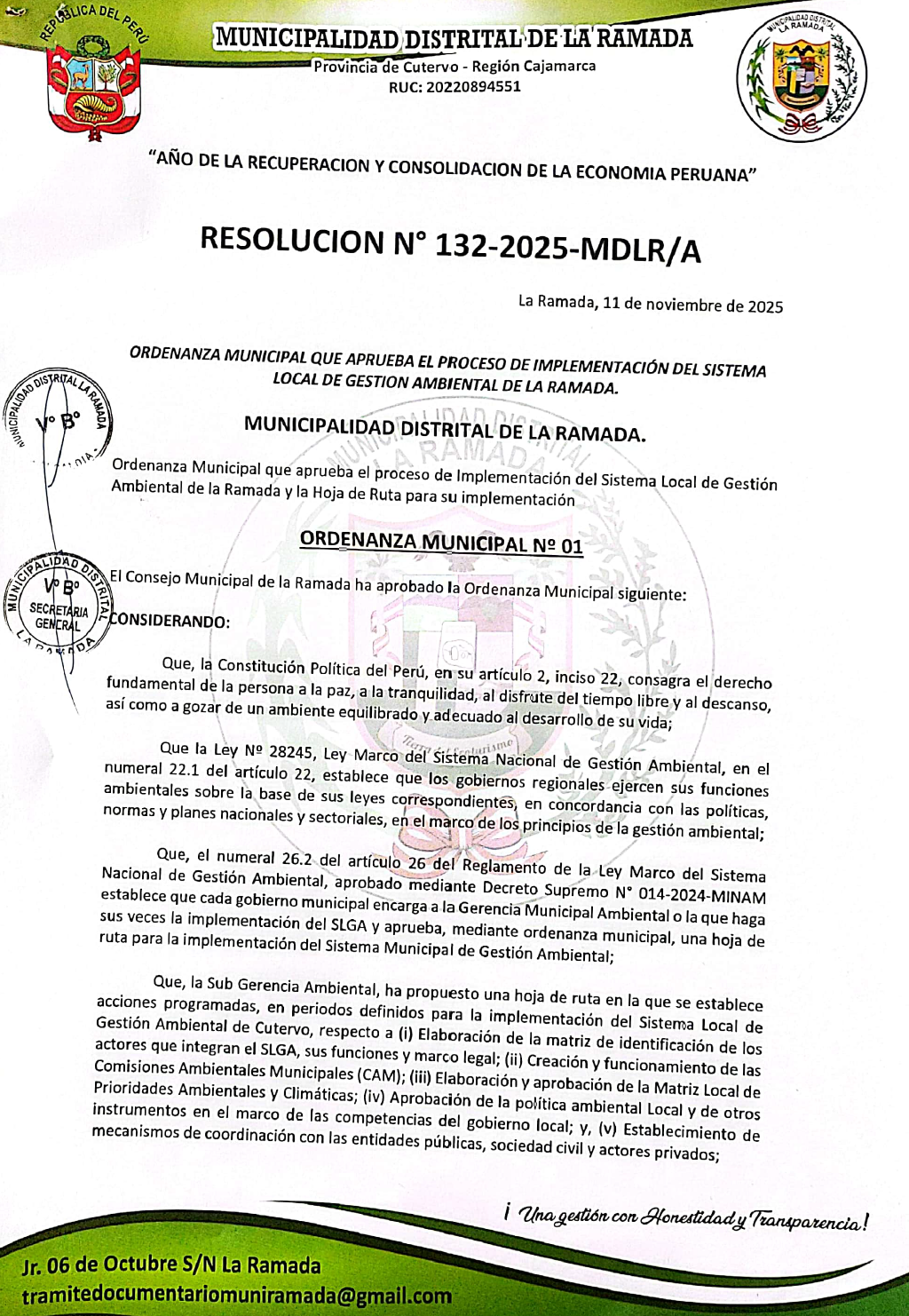 ORDENANZA MUNICIPAL QUE APRUEBA EL PROCESO DE IMPLEMENTACIÓN DEL SISTEMA REGIONAL DE GESTION AMBIENTAL DEL DISTRITO DE LA RAMADA - CUTERVO Y LA HOJA DE RUTA